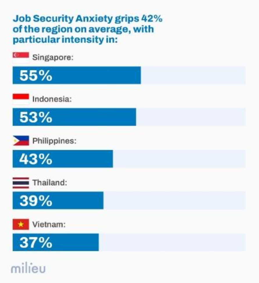 平均而言,42%的东南亚人报告了对这一年就业稳定性的担忧——新加坡(55%)和印尼(53%)的焦虑感最高,其次是菲律宾(43%)、泰国(39%)和越南(37%)。