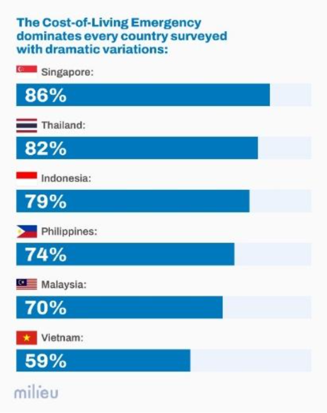 平均而言,75%的东南亚人将生活成本视为关键的国家问题,成为所有六个受访市场中最紧迫的挑战。