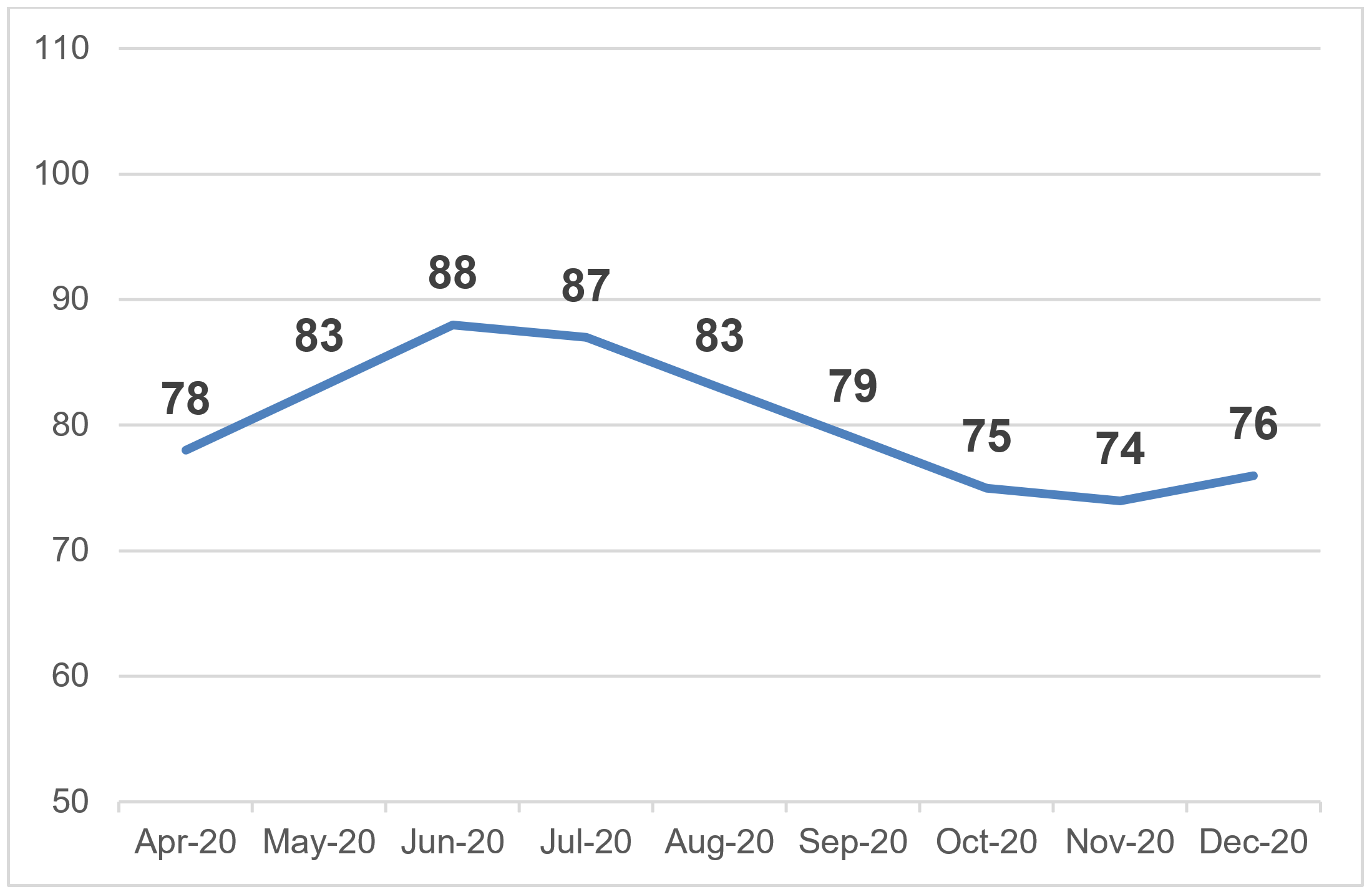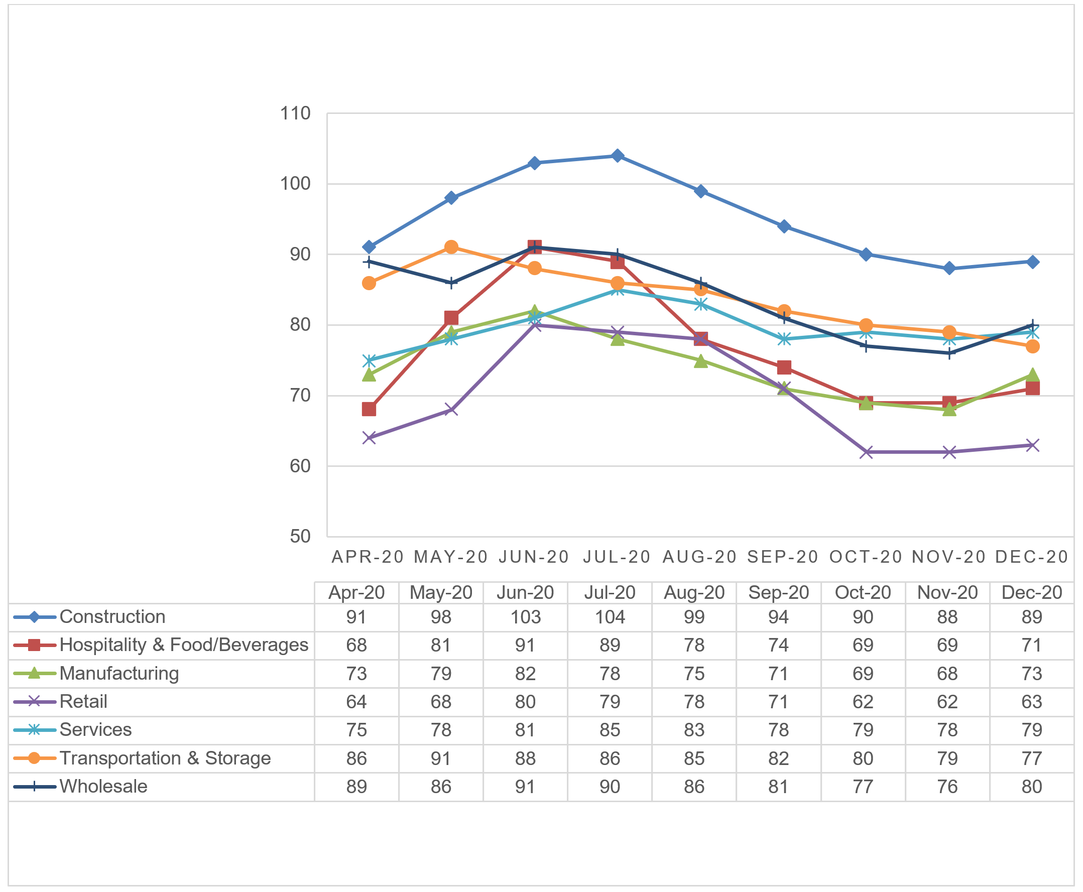 总体而言,企业至今仍然有能力保持欠款偿还能力,主要是因为政府的部分特别补贴措施。无论如何,2020年12月延长了2天的趋势,可能意味着企业重新开始采取保留现金的策略,原因在于政府收紧管制措施,从部分州属到全国重启行动管制令所致。